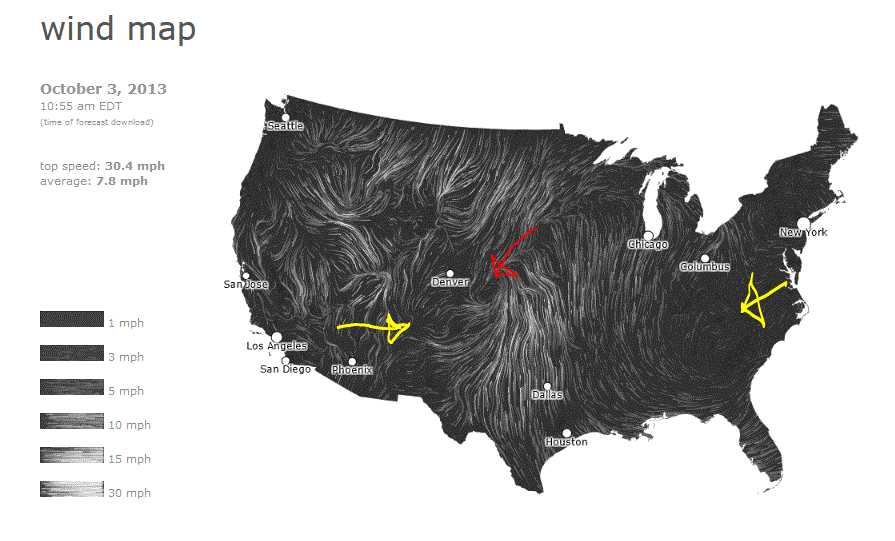 My mom sent me this website a couple of weeks ago. http://hint.fm/wind/index.html It shows the direction and speed of surface winds for the entire country. This screen shot doesn’t do it justice, because on the webpage, the wind lines flow. Beautiful.