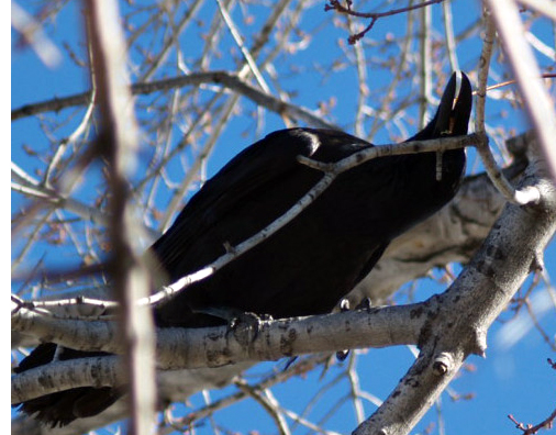 - Angry raven scolds our dog: “Arg! Arg! Arg!” Erect head and neck feathers are a dominance display.