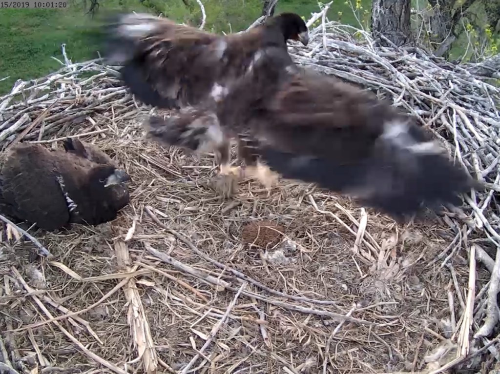More wing-stretching. Only one chick stretches at a time, often in sessions of fifteen minutes or more at a time. They have also moved closer to the edge of the nest.
