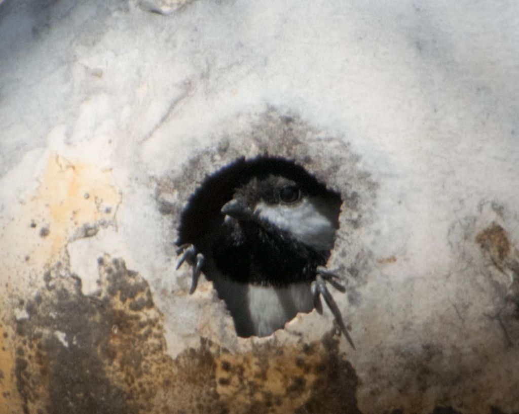 This little gourd birdhouse blew out of the tree during a storm over the winter. We picked it up out of the snow, and re-hung it on the nearest branch. Now, a black-capped chickadee has decided to check it out. The mate sat in the branches nearby.