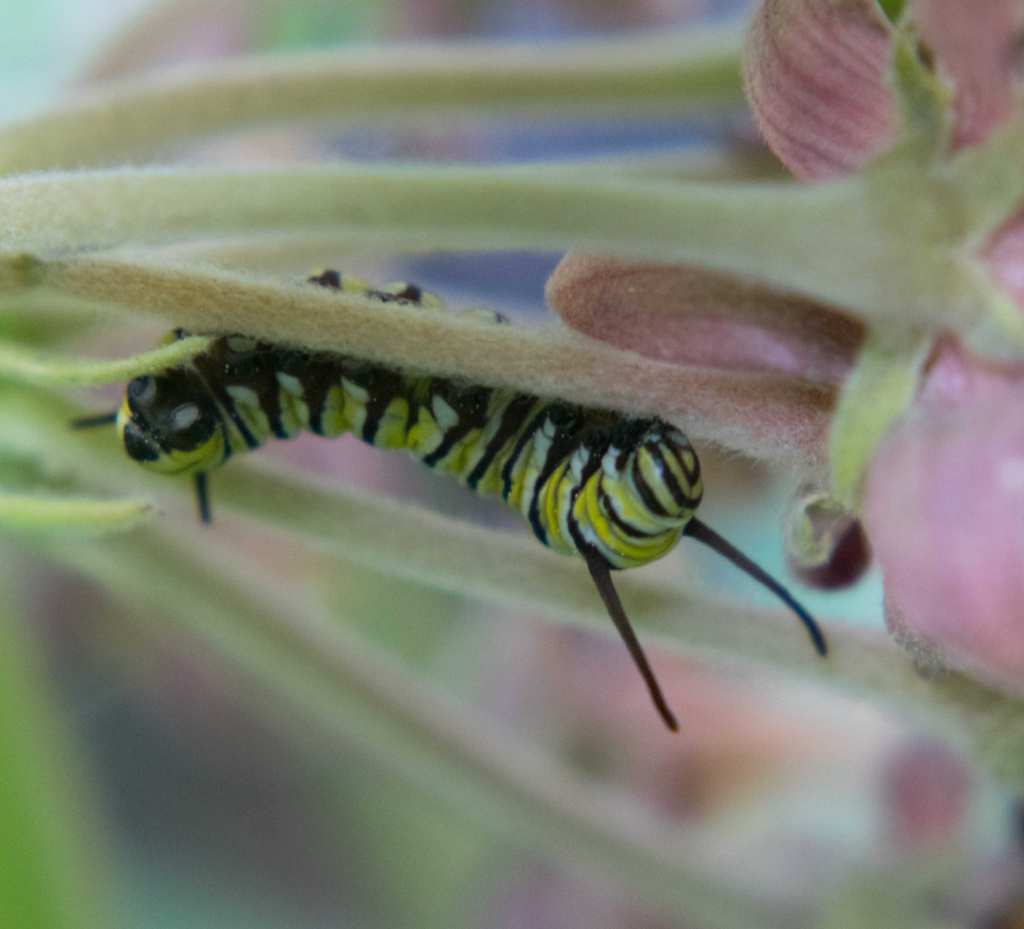 … my husband found two tiny yellow, white and black caterpillars happily gnawing on our milkweed.