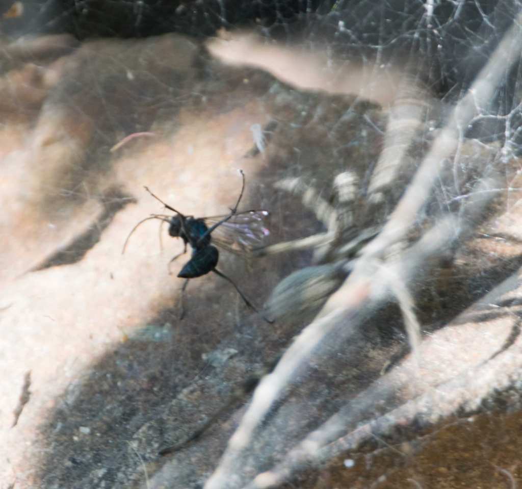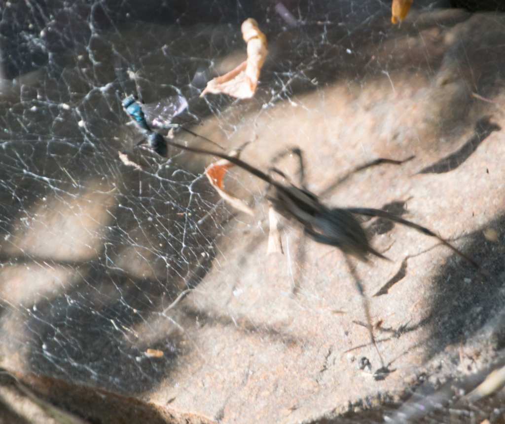 The spider danced around the wasp faster than the camera could catch the images. I assume that, although the wasp was snagged in the web, it could still sting the spider.