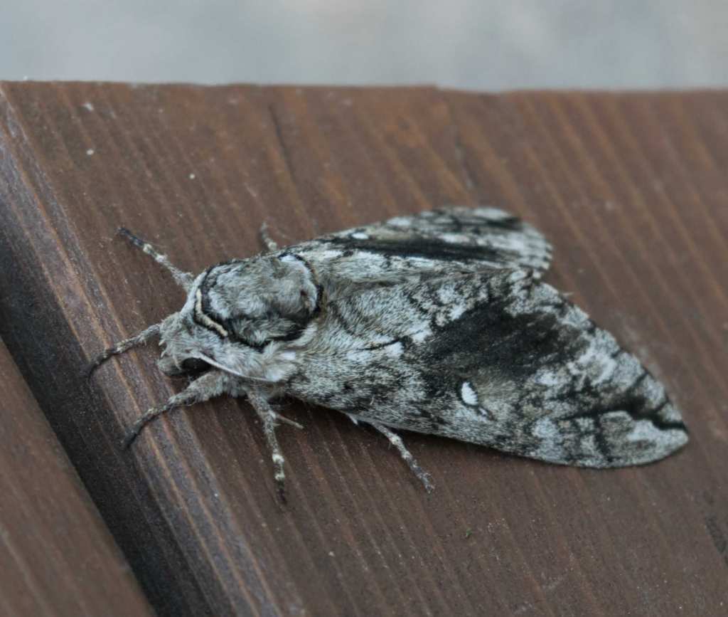 Finally, this is a waved sphinx moth that landed on our porch. You know it’s a moth and not a butterfly because the wings are held horizontal, not vertical as butterflies do most of the time. The white dot on it’s wing helps identify it as a waved sphinx. It’s caterpillar eats the leaves of tress, but the adult doesn’t eat at all. It lives to mate, and lay eggs.