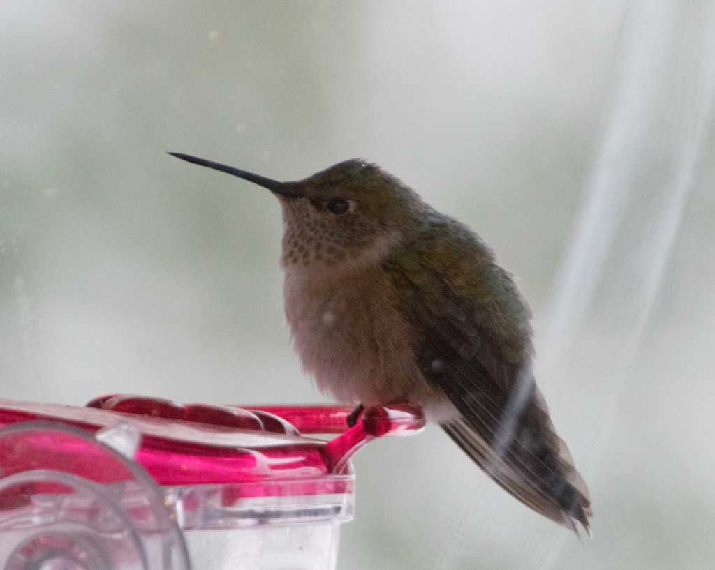 But we had a plan! I have a hummingbird feeder that sticks to the sliding glass door, and so is under the house eaves and would remain snow-free. The little birds completely ignore if there is any other food source available. But this morning, nothing else was clear of snow.