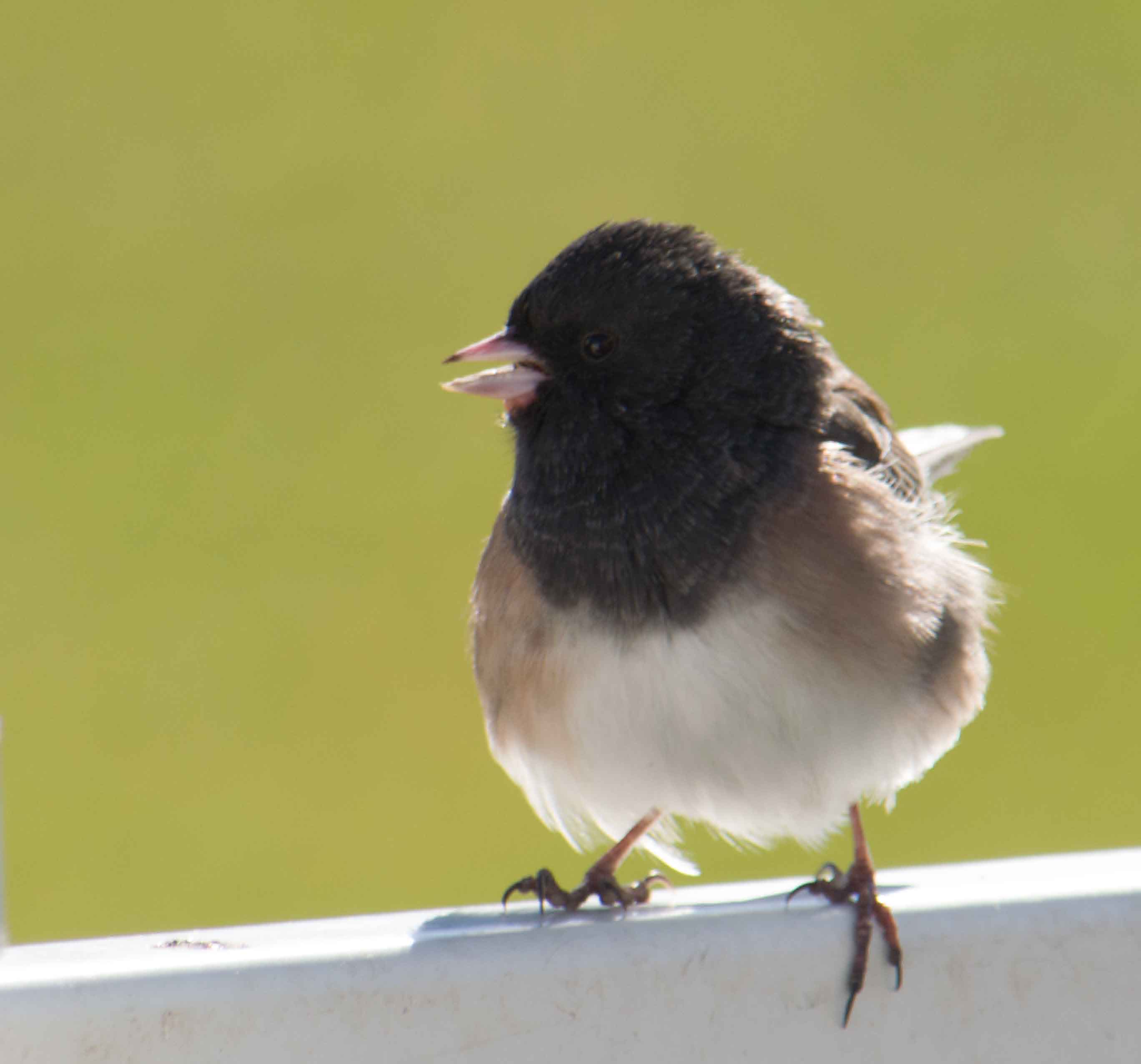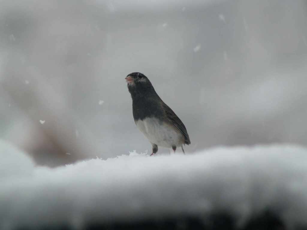 If you look at a lot of bird books, the generic entry Dark-eyed juncos says that they are a type of sparrow with pink to orange bills and legs, and white edges on their tails; they winter south to Mexico, and breed from Alaska and southern Canada all the way to the arctic tundra. Colorado is lucky that they can live here year-round.