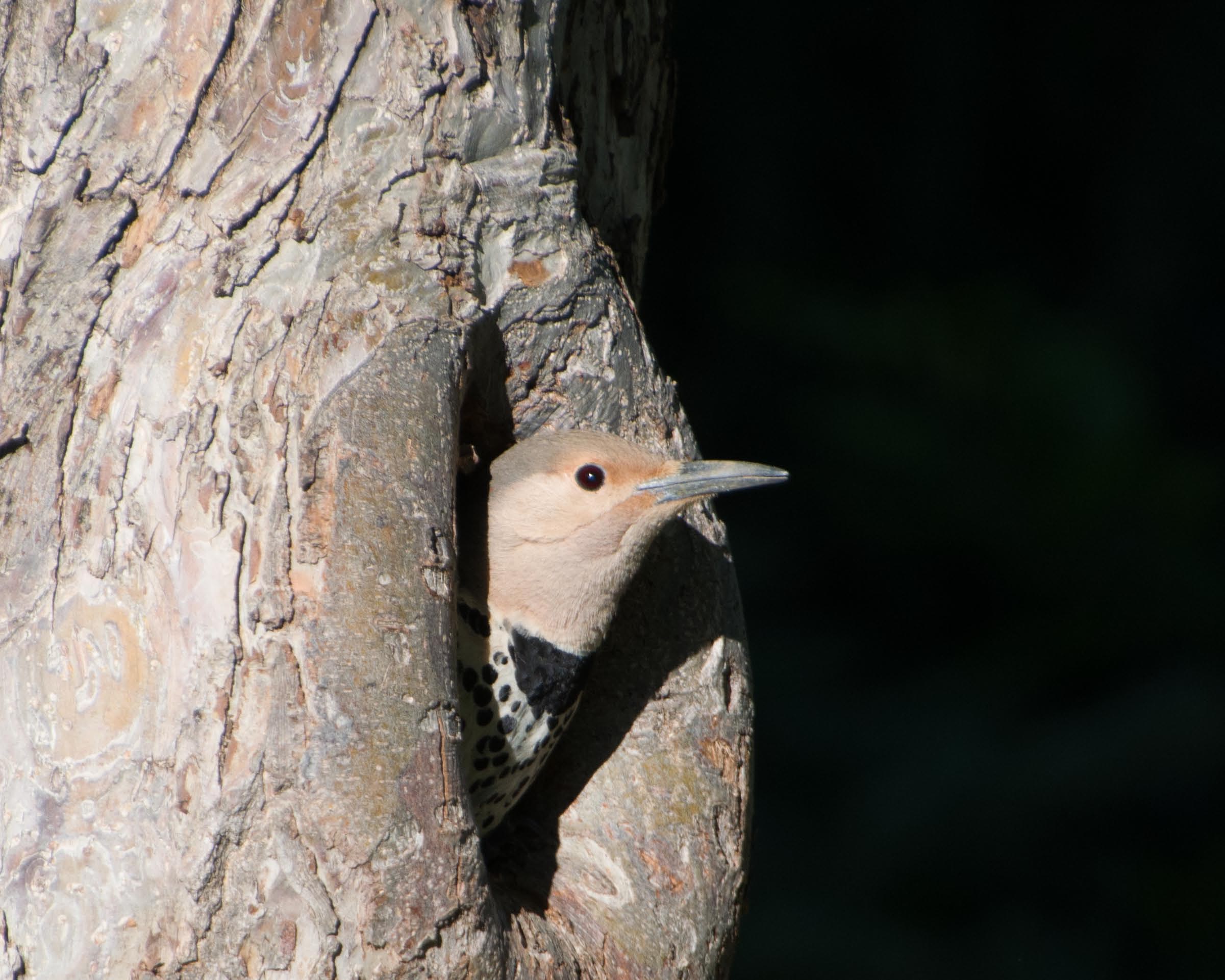 As we started up the hill earlier this week, I saw a funny knob on a tree just a few feet back from the sidewalk. I focused on it and realized it was a female red-shafted flicker, sticking her head out of a hole she’d pecked into a chokecherry tree.