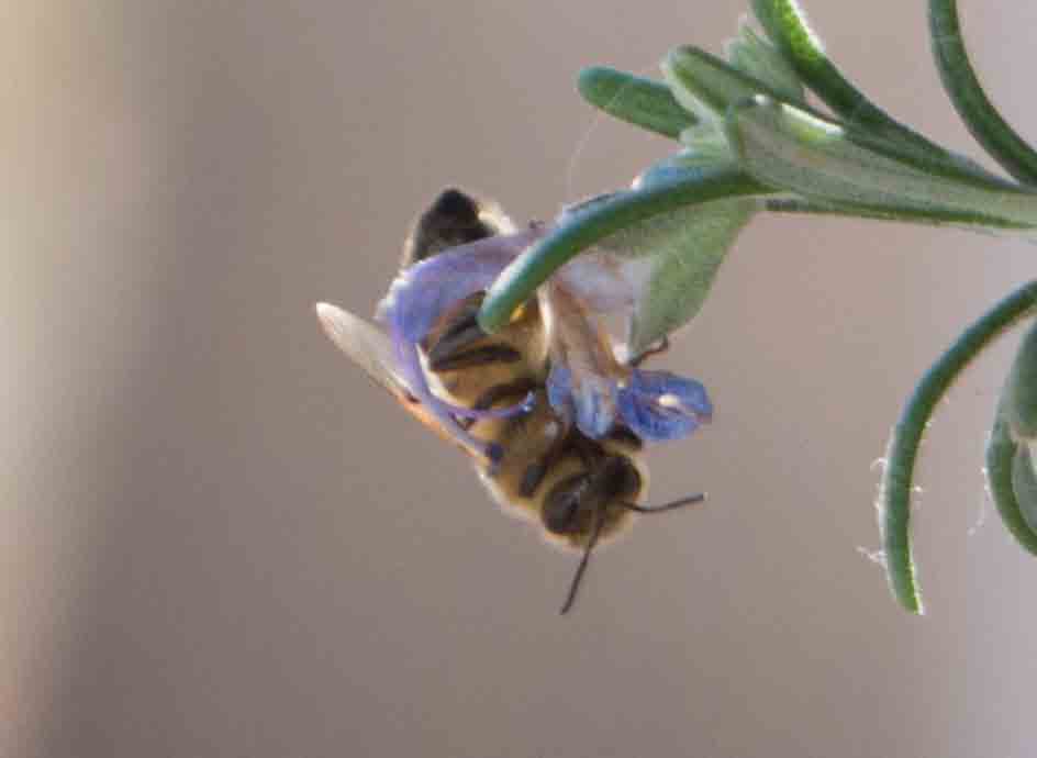 Several — not a lot, but more than should be out at this time of year — honeybees were visiting the rosemary plants I have in pots on the back deck. Over the course of the hour I watched them, there was always one bee around.