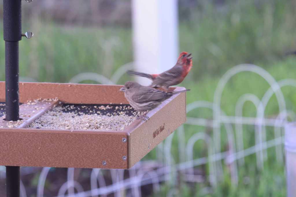 Then I noticed a brilliant red male finch frantically dancing around a female, who kept pushing him away. He was dancing so fast that, with my camera out of whack, I didn’t get photos that do him justice.