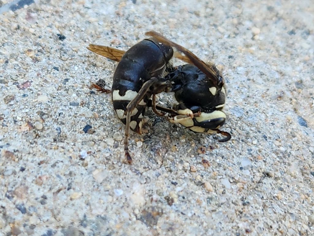 When I started researching bald-faced hornets, the first websites suggested had titles like “10 Terrifying Reasons to Kill Bald-Faced Hornets!” These were from pest control (exterminator) companies. When I looked at sites like the one from Pennsylvania State University, their response was much more measured. Bald-faced hornets prey on flies and other species of yellowjackets. They try their hardest to ignore humans. If you leave them alone, they will return the favor.