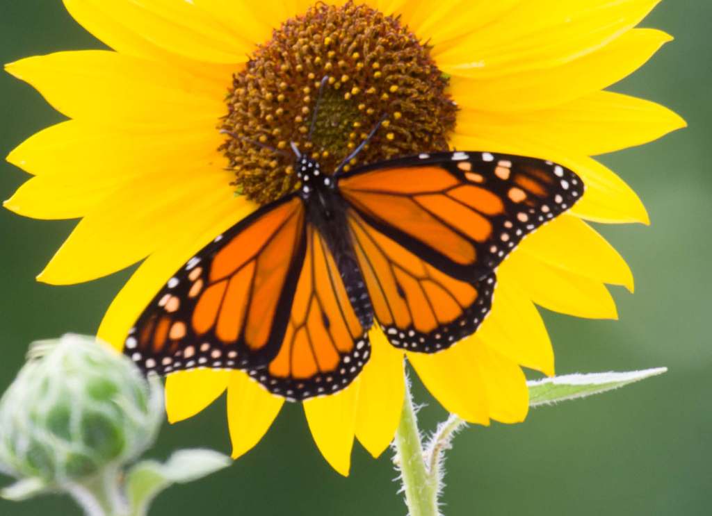 I stepped out into our front garden this afternoon and was treated to a Monarch butterfly circling a patch of sunflowers, occasionally landing and sticking it’s tongue into the tiny disk flower that actually produce pollen, nectar, and ultimately, sunflower seeds.