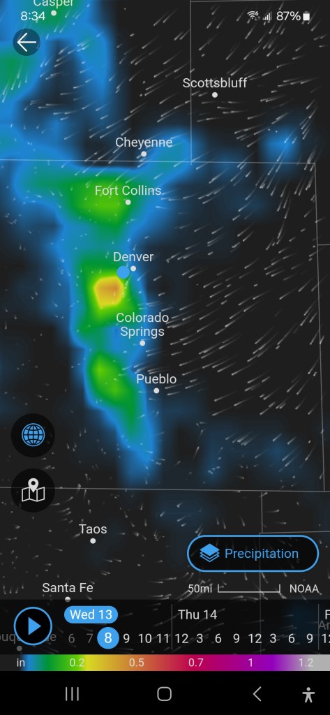 This image from my phone weather app shows the wind blowing briskly — right up until it hits — literally hits — the Front Range. You can’t tell from this image, because it is take at just one elevation, but the wind then rises. The moisture is too heavy to make the upward turn, and falls. Because it’s spring, this moisture is falling as very wet snow that shows up as all the pretty colors in the mountains west of the major cities. You can tell where the other side of the mountains are because the colors return to black, and there are no streaks showing wind. The result is nine inches of snow in the cities, and feet of snow in the mountains.